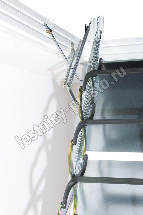 Благодаря «ножничной» системе складывания в сложенном виде лестница LSF очень компактна, и соответственно имеет небольшой размер крышки люка. Специальный механизм регулировки угла открывания крышки люка позволяет подогнать высоту лестницы под высоту потолка.