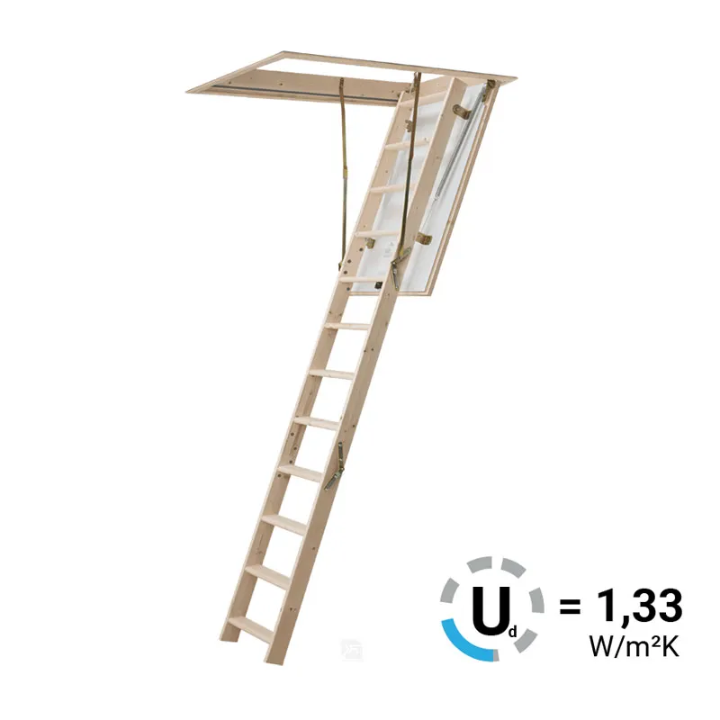 Супертеплоизоляционная лестница обладает повышенной теплоизоляцией и низкими показателями воздухопроницаемости крышки. Крышка люка выполнена из пенополистирола без применения дополнительных деревянных элементов. Новый профиль короба лестницы позволяет проще и быстрее установить декоративные планки.