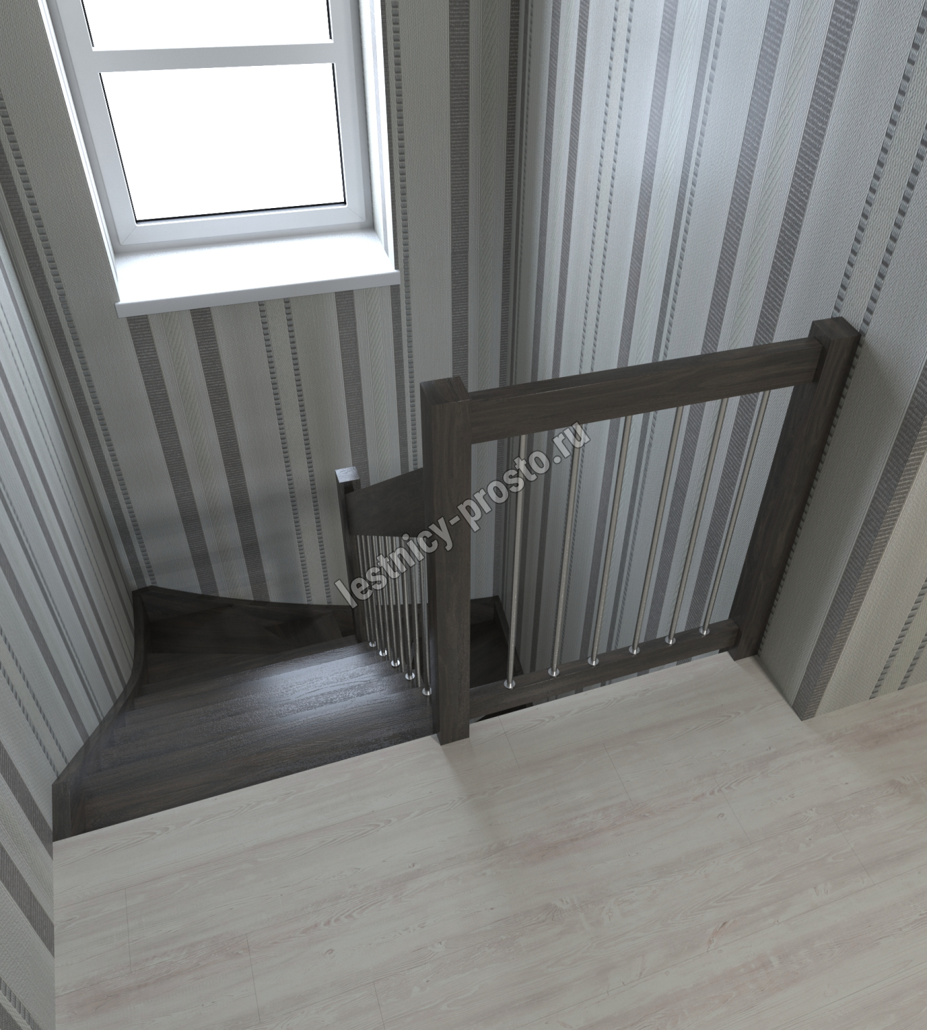 Вид лестницы по реализации поворота: с поворотом на 90° через площадку, с поворотом на 90° через 4 забежные ступени;