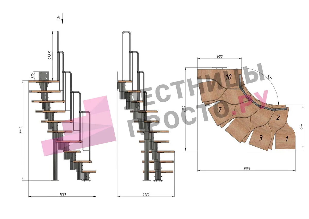 | Лестница Prosto Urban White гусиный шаг 600 мм, h180-264 см (10 ступеней), дуб |
