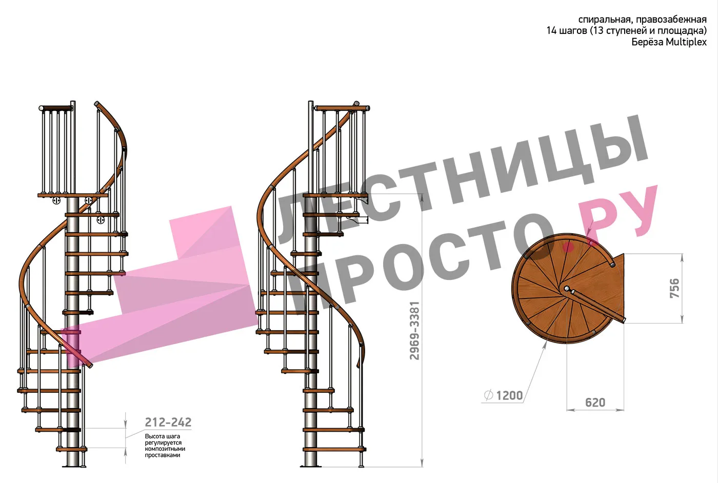 Высота лестницы 2969 - 3381 (13 ступеней) мм