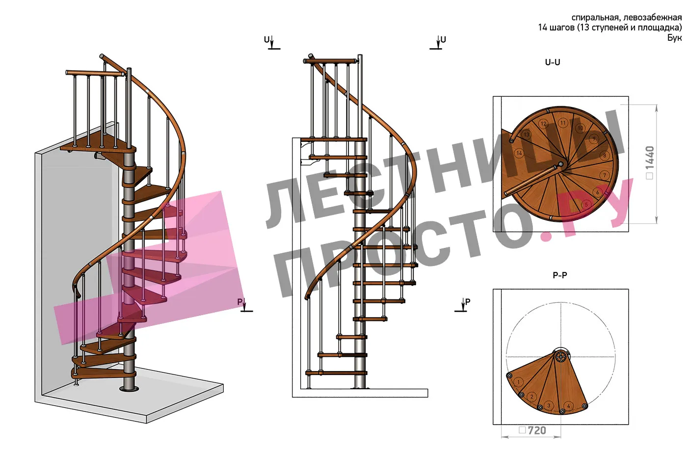 Левая, d=140см, 13 ступеней + площадка